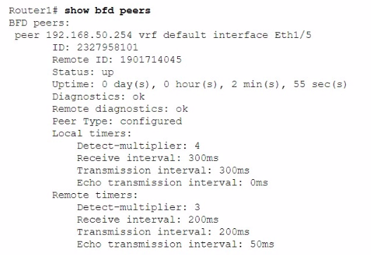 The local timers in the BFD (Bidirectional Forwarding Detection) configuration show a detect multiplier of 4 and a receive interval of 300ms. The time taken to detect remote failures is calculated as detect multiplier receive interval = 4 300ms = 1200ms.