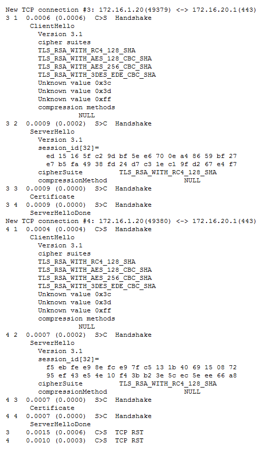 A client side ssldump did NOT show any differences between the traffic going directly to the server and the traffic being processed by the LTM device. However, packet capture was done on the server, and differences were noted.