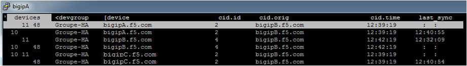 An LTM Specialist is troubleshooting a sync-failover group of three BIG-IP LTM devices. The command used is "tmsh run cm watch-devicegroup-device."