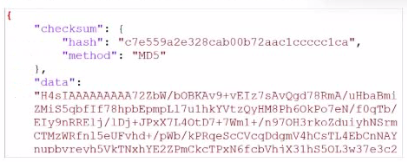The data field is likely a base64-encoded string, which is commonly used to represent binary data in text format. Base64 encoding is often applied to data that has been compressed (zipped) for easier handling and transfer. The checksum field, with an MD5 hash, provides a way to verify the integrity of the data after decompression.