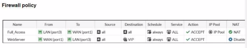 The first firewall policy has NAT enabled using the IP pool The second firewall policy is configured with a VIP as the destination address.