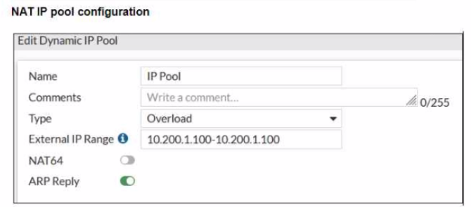 IP Pool Configuration: The IP pool is configured with an external IP range of 10.200.1.100.