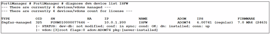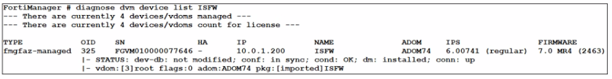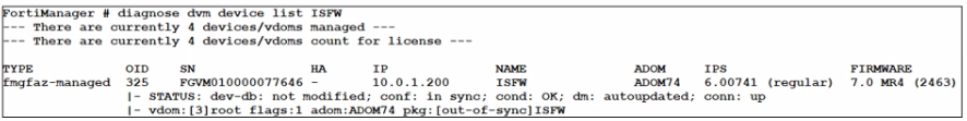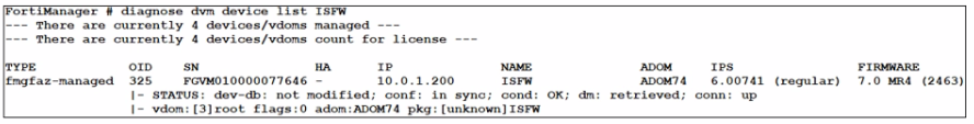 In the provided options, we are analyzing the FortiManager diagnose dvm device list output for the ISFW device.