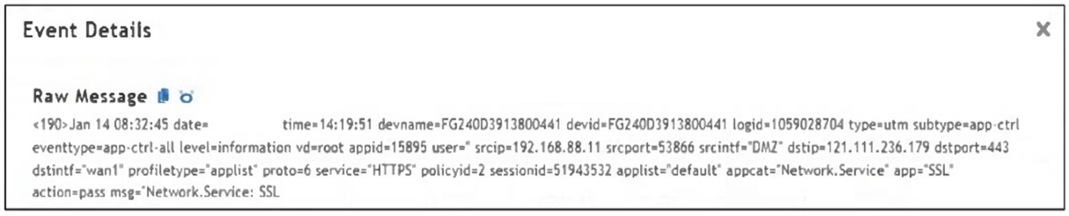 The Application Name field in FortiSIEM is typically populated using the value of the app field in the raw log. In this event, app='SSL', so 'SSL' is the expected application name parsed by FortiSIEM.