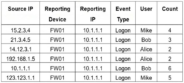 Grouping by User, Source IP, and Count means that each unique combination of those three attributes will be treated as a separate result. In the table, all six rows have distinct combinations of User, Source IP, and Count - so FortiSIEM will display 6 results.