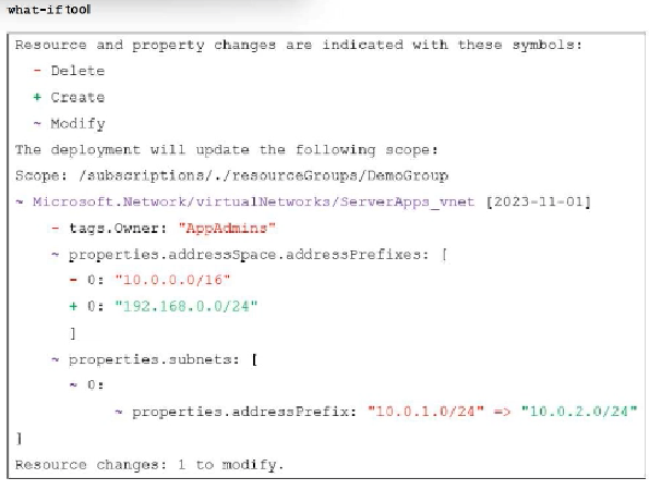 An administrator used the what-if tool to preview changes to an Azure Bicep file.