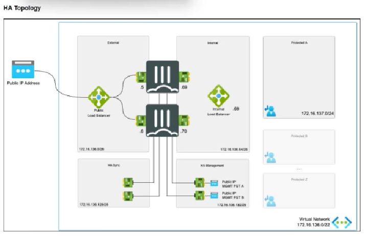The exhibit shows an active-passive high availability FortiGate pair with external and internal Azure load balancers.