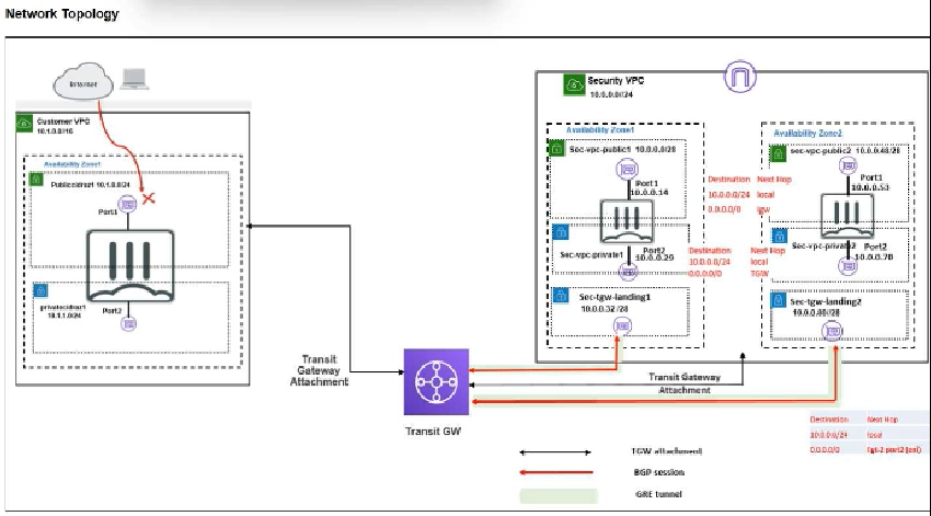 Also, you must ensure that the Customer VPC FortiGate VM sends all the outbound internet traffic through the Security VPC.