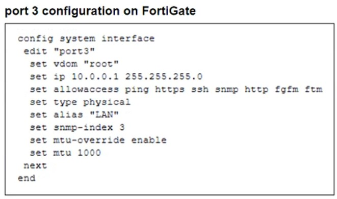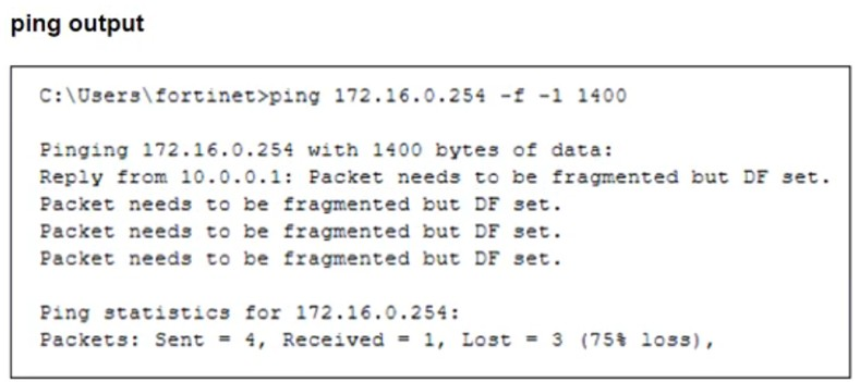 The issue occurs because FortiGate enforces the 'do not fragment' (DF) bit in the packet, and the packet size exceeds the MTU of the network path. When the Windows PC1 (with an MTU of 1500 bytes) attempts to send a 1400-byte packet, the FortiGate interface (with an MTU of 1000 bytes) needs to fragment it. However, since the DF bit is set, FortiGate drops the packet instead of fragmenting it.