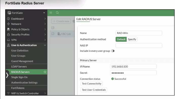 The FortiGate configuration confirms that it can connect to the RADIUS server without issues.