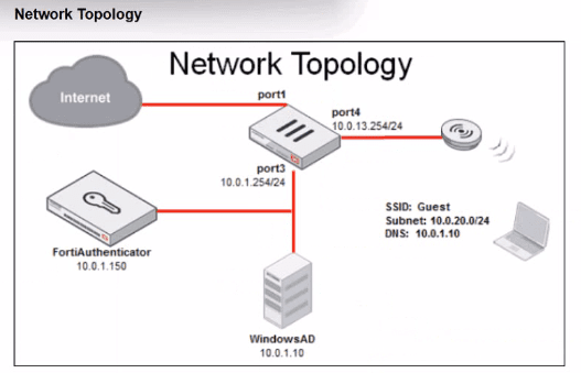 Create or modify a firewall policy thatallows traffic from the Guest SSID subnet/interface to FortiAuthenticator and WindowsAD without requiring user authentication.