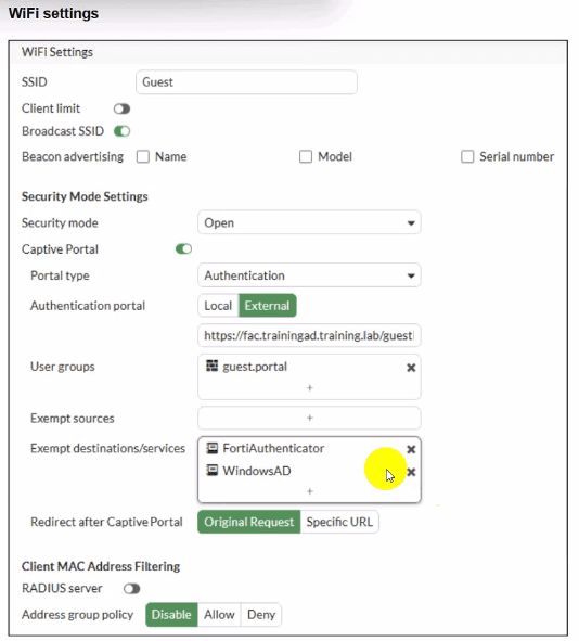 External portal URL: https://fac.trainingad.training.lab/guest (FortiAuthenticator)