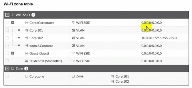 In the Wi-Fi zone table, onlyCorp.102has an IP subnet: