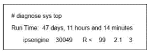 Exhibit: The diagnose sys top output shows the ipsengine process is in a run state (R) consuming 99% CPU.