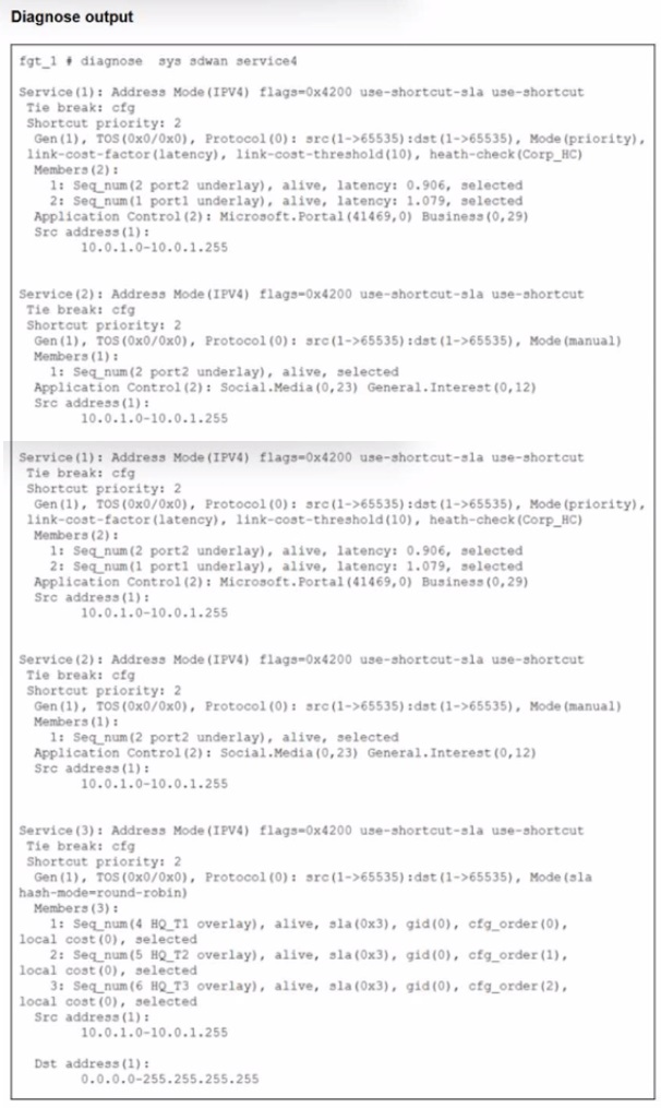 The exhibit shows output of the command diagnose sys adwan aervice4 collected on a FortiGate device.