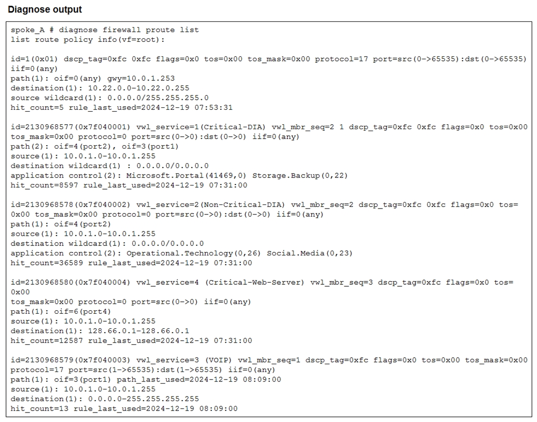 UDP traffic destined to the subnet 10.22.0.0/24 matches a policy route The first entry (id=1) shows protocol=17 (UDP) with destination 10.22.0.0/24, confirming this traffic is handled by a policy route instead of an SD-WAN rule.