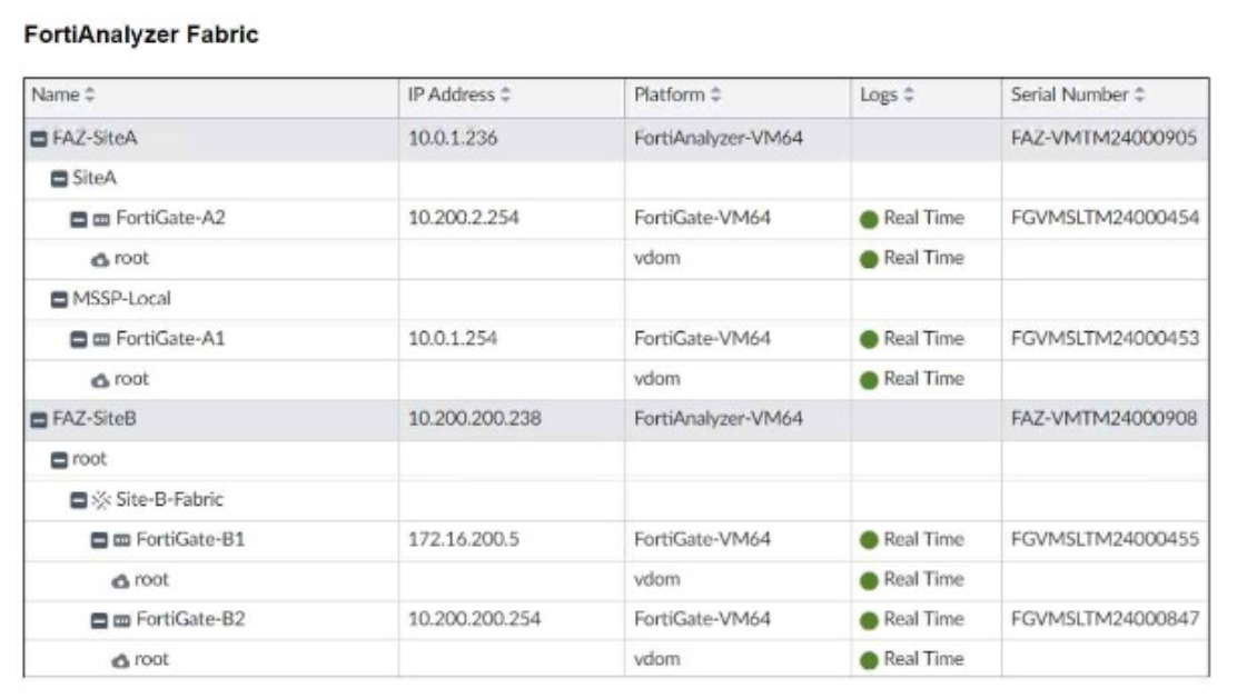 FAZ-SiteA and FAZ-SiteB are FortiAnalyzer devices in the fabric.