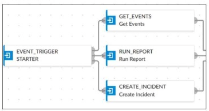 The playbook in the exhibit consists of three main actions: GET_EVENTS, RUN_REPORT, and CREATE_INCIDENT.