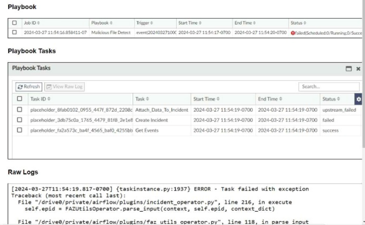 The exhibit shows that the Create Incident task has failed, and the Attach_Data_To_Incident task has also failed.