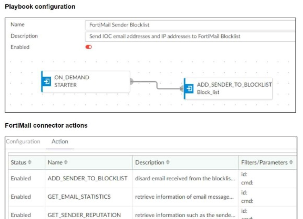 The FortiMail Sender Blocklist playbook is configured to take manual input and add those entries to the FortiMail abc. com domain-level block list. The playbook is configured to use a FortiMail connector and the ADD_SENDER_TO_BLOCKLIST action.