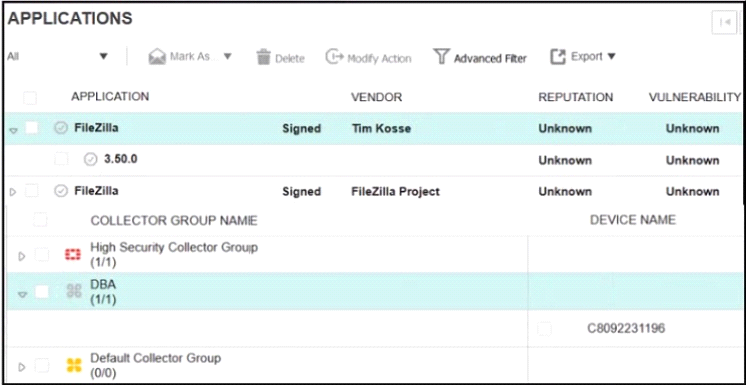 The exhibits show application policy logs and application details Collector C8092231196 is a member of the Finance group