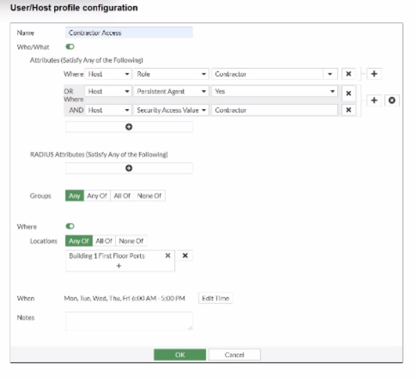 Furthermore, the profile includes Location and When (time) constraints. The exhibit shows the location is restricted to the 'Building 1 First Floor Ports' group. The 'When' schedule is explicitly set to Mon-Fri 6:00 AM - 5:00 PM. For a profile to match, all enabled sections (Who/What, Locations, and When) must be satisfied simultaneously. Therefore, the host must meet the conditional contractor/agent criteria, possess the specific security access value, and connect during the defined 6 AM to 5 PM window.