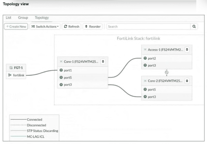 According to theFortiSwitchOS 7.6 Administration Guideand theFortiLink 7.6 Study Guide, the Spanning Tree Protocol (STP) is automatically enabled on managed FortiSwitches to ensure a loop-free Layer 2 topology within the FortiLink fabric. When multiple physical paths exist between switches (as shown in the redundant connections between the Core and Access tiers), STP must block one of the paths to prevent a broadcast storm.