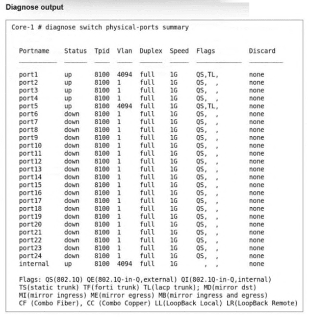 The output of the diagnose switch physical-ports summary command provides critical insight into how a FortiSwitch is being managed by examiningVLAN assignments,tag protocol identifiers (TPID), andinternal port behavior. In the provided exhibit, several ports---includingport1,port5, and theinternalport---are assigned toVLAN 4094.