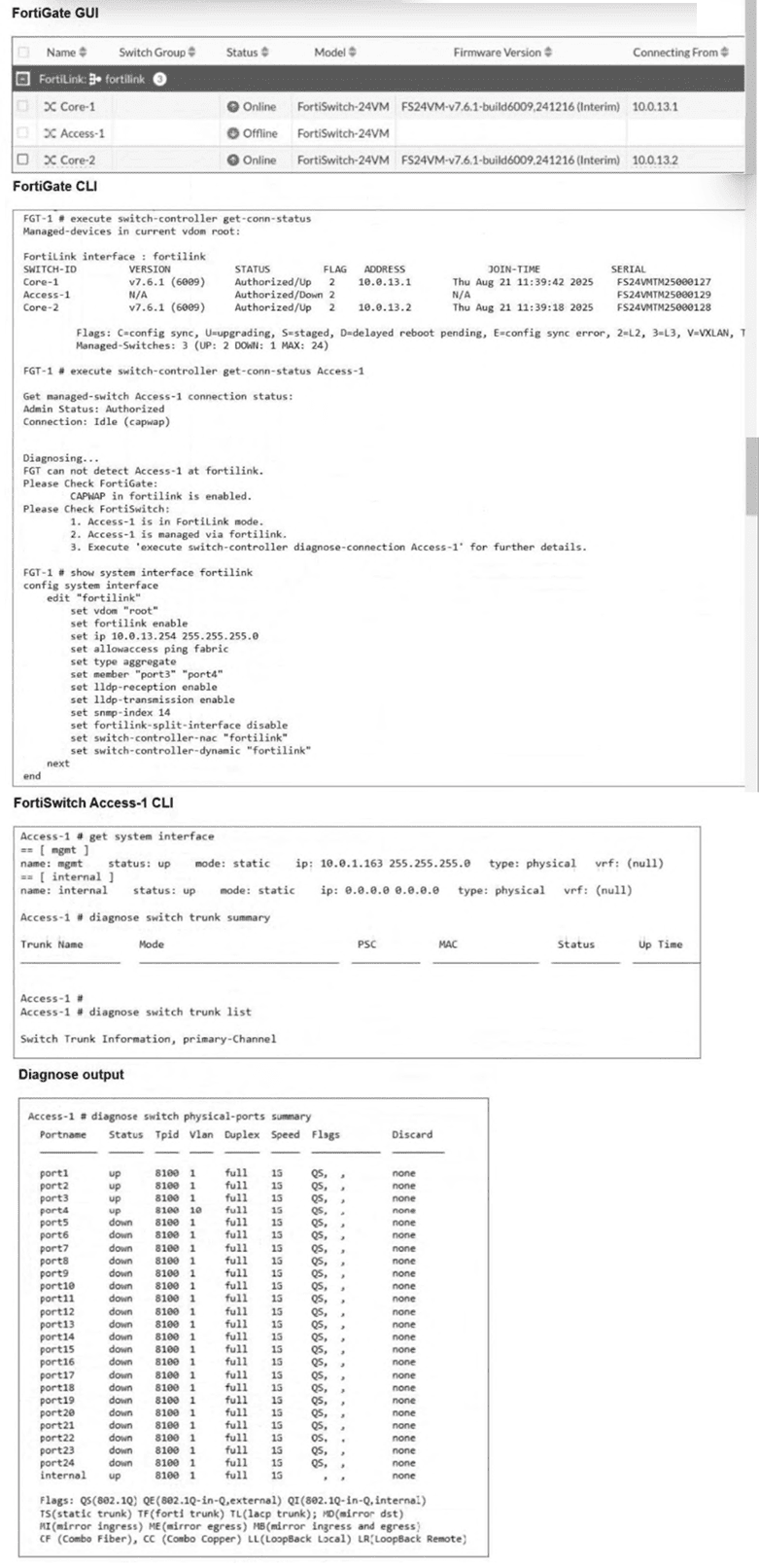 Examining the FortiSwitch Access-1 CLI output reveals the key issue: