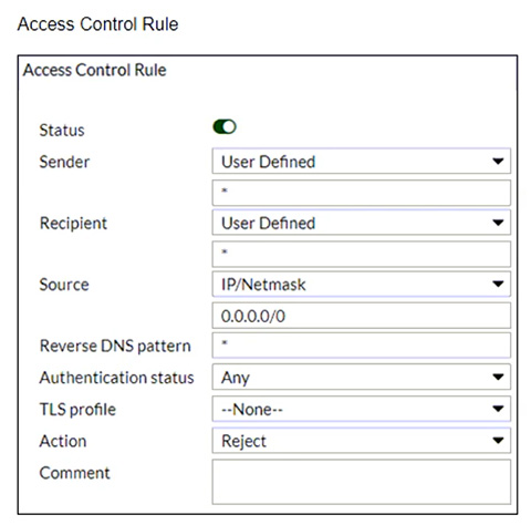Which three access control settings are recommended to allow outbound email from the example.com domain on FML-1? (Choose three.)