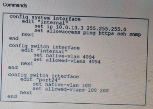 Adding port24 native VLAN to the allowed VLANs on internal (Option A): The management VLAN (VLAN 4094 in this case, as it is set as the native VLAN on the 'internal' interface of the FortiSwitch) must be included in the allowed VLANs on the interface that provides management connectivity. Since port24 is set with a different native VLAN (VLAN 100), VLAN 4094 (the management VLAN) should be allowed through to ensure connectivity.