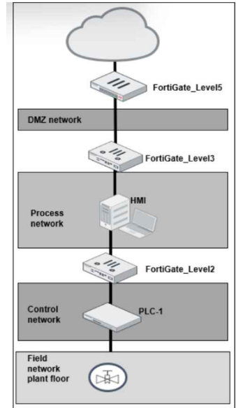 The study guide also states in the Purdue model section that ''Level 2 consists of the processes and programs that control the PLCs, RTUs, and IEDs found at Level 1'' and that ''it is necessary to segment, or even microsegment, these servers with firewall segmentation, along with policies that include application control and virtual patching.'' In addition, the virtual patching section says ''Virtual patching protects OT devices that have not yet been updated against vulnerability exploits'' and applies when traffic related to the vulnerable device reaches the firewall policy. Since FortiGate_Level2 sits between the process network and the control network, it is the right enforcement point for virtual patching to protect the PLC-side assets.