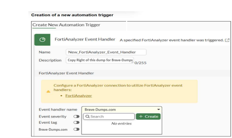 Option C is incorrect because + Create is not the reason the existing event handler is missing; it is only an interface control. Option D is not the best answer for this item because the question is about why the event handler name list on FortiGate is empty for FortiAnalyzer-triggered automation. The study guide's verified requirements for that workflow are the FortiAnalyzer-to-FortiGate Fabric connection and enabling Automation Stitch on the FortiAnalyzer event handler.