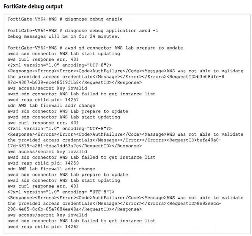Another common reason for authentication failures in AWS API calls is a clock skew between the FortiGate device and AWS. AWS requires that the system time of the client making the API call is synchronized with its own time, within a small margin. If there is a significant time difference, AWS will reject the credentials (Option B).