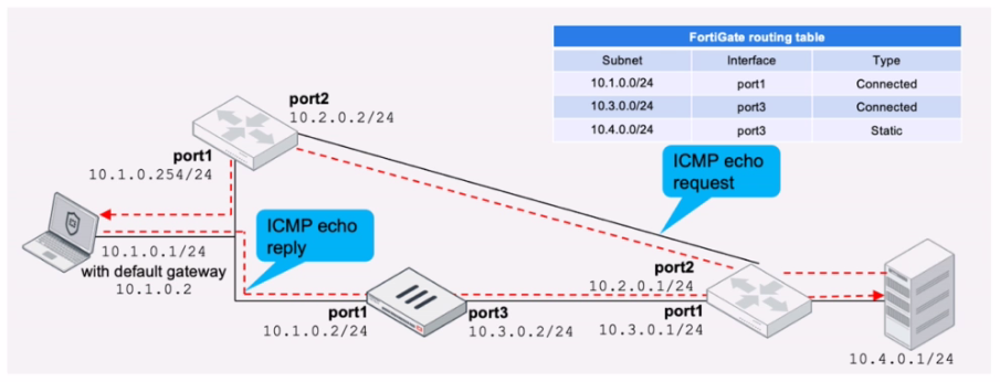 FortiGate has already been configured with a firewall policy that allows all ICMP traffic to flow from port1 to port3.
