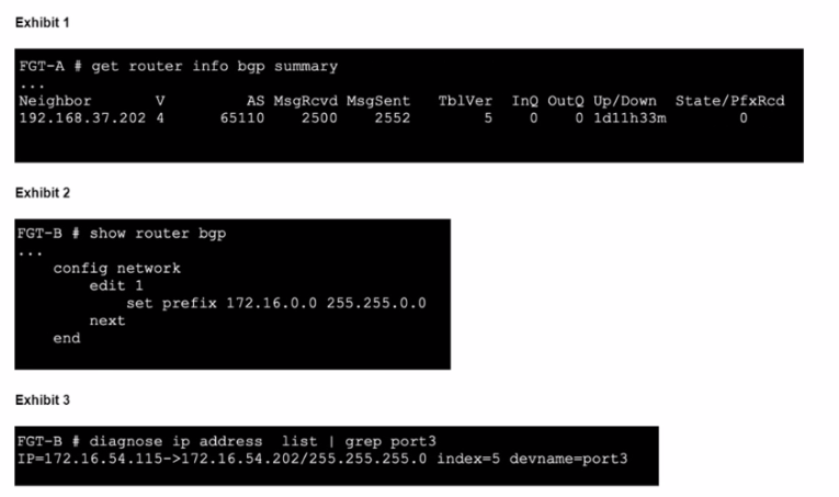 Ensure that the BGP configuration on FGT-B is correctly set to advertise the network 172.16.54.0/24.