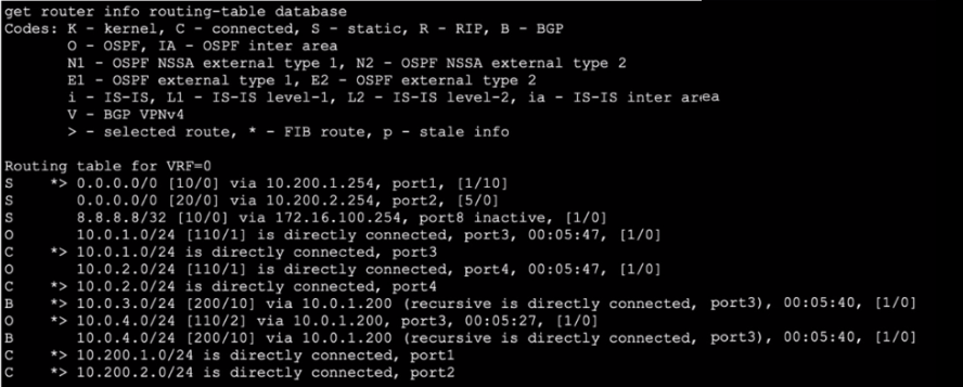 The entry S * 0.0.0.0/0 [20/0] via 10.200.2.254, port2, [5/0] indicates that there is a static route to the default gateway (0.0.0.0/0) through port2 with a gateway IP of 10.200.2.254.