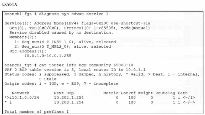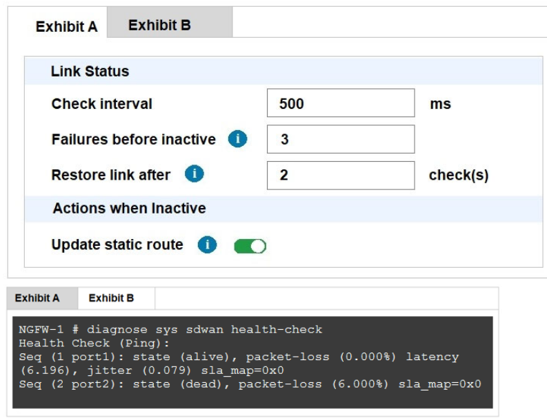 Exhibit A, which shows the SD-WAN performance SLA and exhibit B shows the health of the participating SD-WAN members.