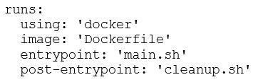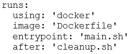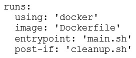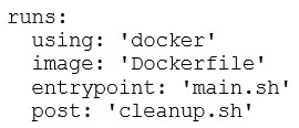 As a DevOps engineer, you are developing a container action. You need to execute a cleanup script after completing the main script execution. Which code block should be used to define the cleanup script?