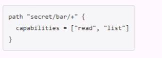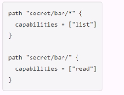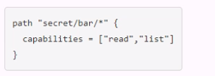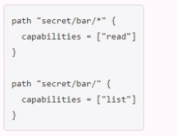 You have been tasked with writing a policy that will allow read permissions for all secrets at path secret/bar. The users that are assigned this policy should also be able to list the secrets. What should this policy look like?