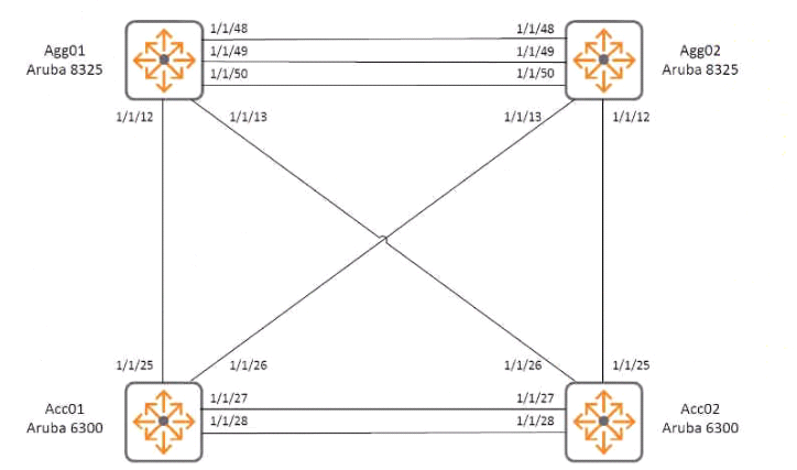 The ports of the Aruba 8325 switches used for Agg01 and Agg02 are populated as follows