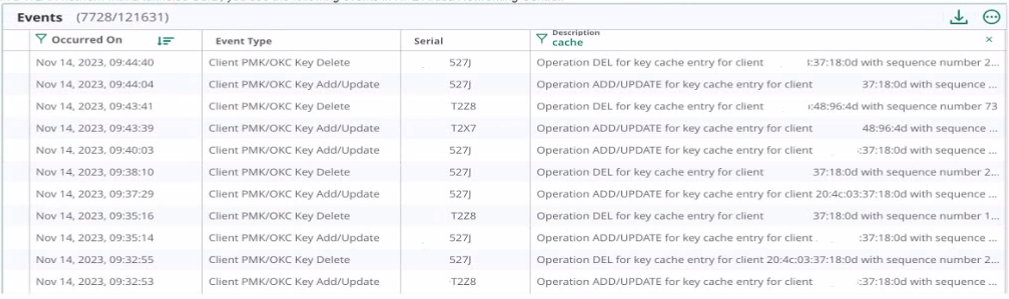 The event log showing PMK (Pairwise Master Key) and OKC (Opportunistic Key Caching) key add/update and delete operations is indicative of normal client behavior in a WLAN environment. These events are part of the standard process for maintaining client session security and do not necessarily indicate any issue.