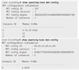 If both switches are configured with default spanning-tree priorities and both appear as primary root bridges, to have a single spanning tree domain, matching MST configuration (Multiple Spanning Tree) must be created on Core-2 to align with Core-1.