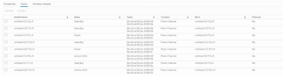 In the exhibit, several paths show ''Standby'' and some appear ''Dead'', while only a subset is Active (0). This typically indicates that one storage controller may be missing or offline, which reduces redundancy and can cause performance degradation. In a healthy Peer Persistence environment, both controllers should present active and non-optimized paths.