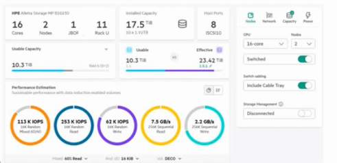 From the exhibit, the system shows maximum estimated IOPS performance (over 250K IOPS read, 115K IOPS mixed, 62K write). These values align with HPE's published performance specifications for this model with full cores enabled. The network interface count and disk count are balanced relative to controller capability. Therefore, no further upgrades are required to achieve maximum performance.