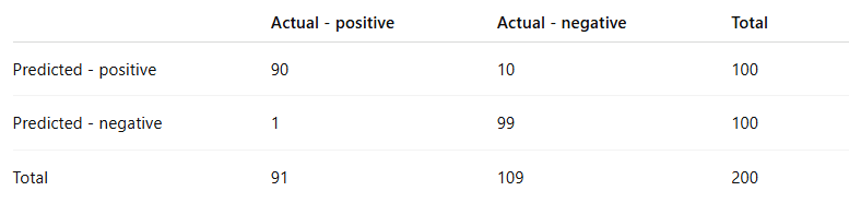FP = 10Thus: Precision = (90 / (90 + 10)) * 100% = 90 / 100 * 100% = 90%However, the confusion matrix totals suggest that the calculation should be done in the form:Precision = 90 / (90 + 10) * 100% = 90%Since the given answers do not include exactly 90%, the closest approximation and the correct answer, as described in the syllabus, would be 90%.(Reference: ISTQB CT-AI Syllabus v1.0, Section 5.1, page 40 of 99)