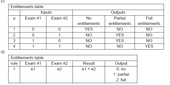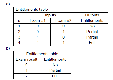 Suppose you are testing a new professional exam support system. As input the system takes two grades from two exams. For each exam the possible grade is 0 or 1 point. As output the system returns a single string -- the decision about the entitlements: if the total score is 2, the candidate receives full entitlements. If the total score is 1, she receives partial entitlements. If the total score is 0, the candidate fails and receives no entitlements.