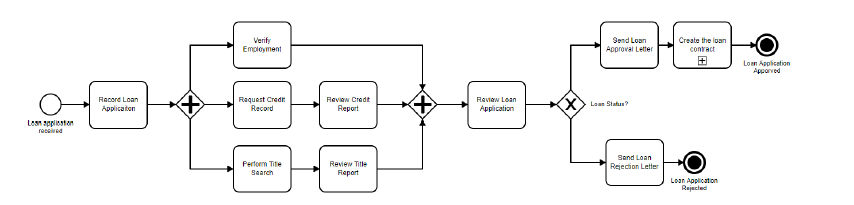 The loan request process starts when the customer submits a loan application. The bank then reviews the application. Regardless of whether the loan request is approved or not, a letter is sent to inform the customer of the decision. If the request is approved, the loan contract is created.