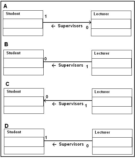At a technical college, each student is supervised by a lecturer. Some lecturers supervise several students, some none. Which of the following class diagrams best shows this student-lecturer relationship? (2 Points)