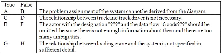 You are employed as a requirements engineer in a company in the logistics sector and are involved in a project that aims to replace a legacy application for distribution and shipment of goods with a new system. A colleague has already created a context diagram. You are assigned to check this. What are your thoughts about this? Indicate for each statement whether it is true or false. (3 Points)